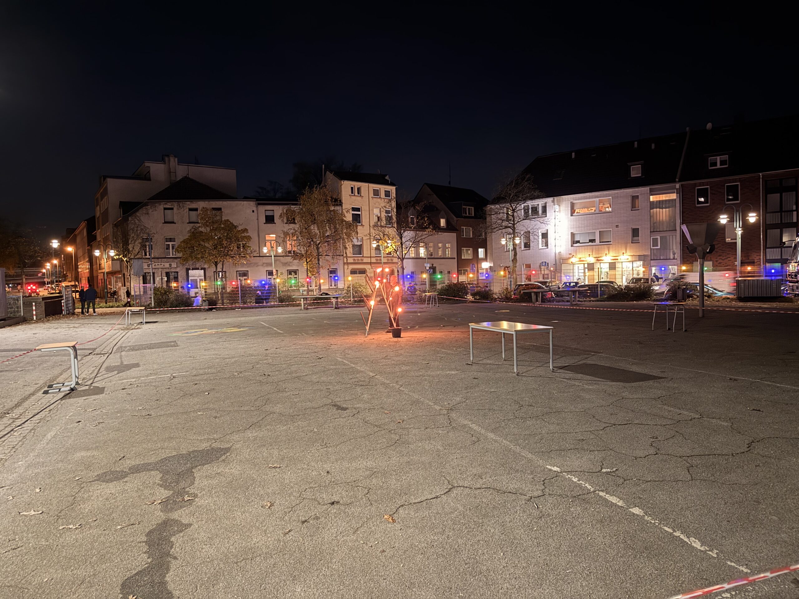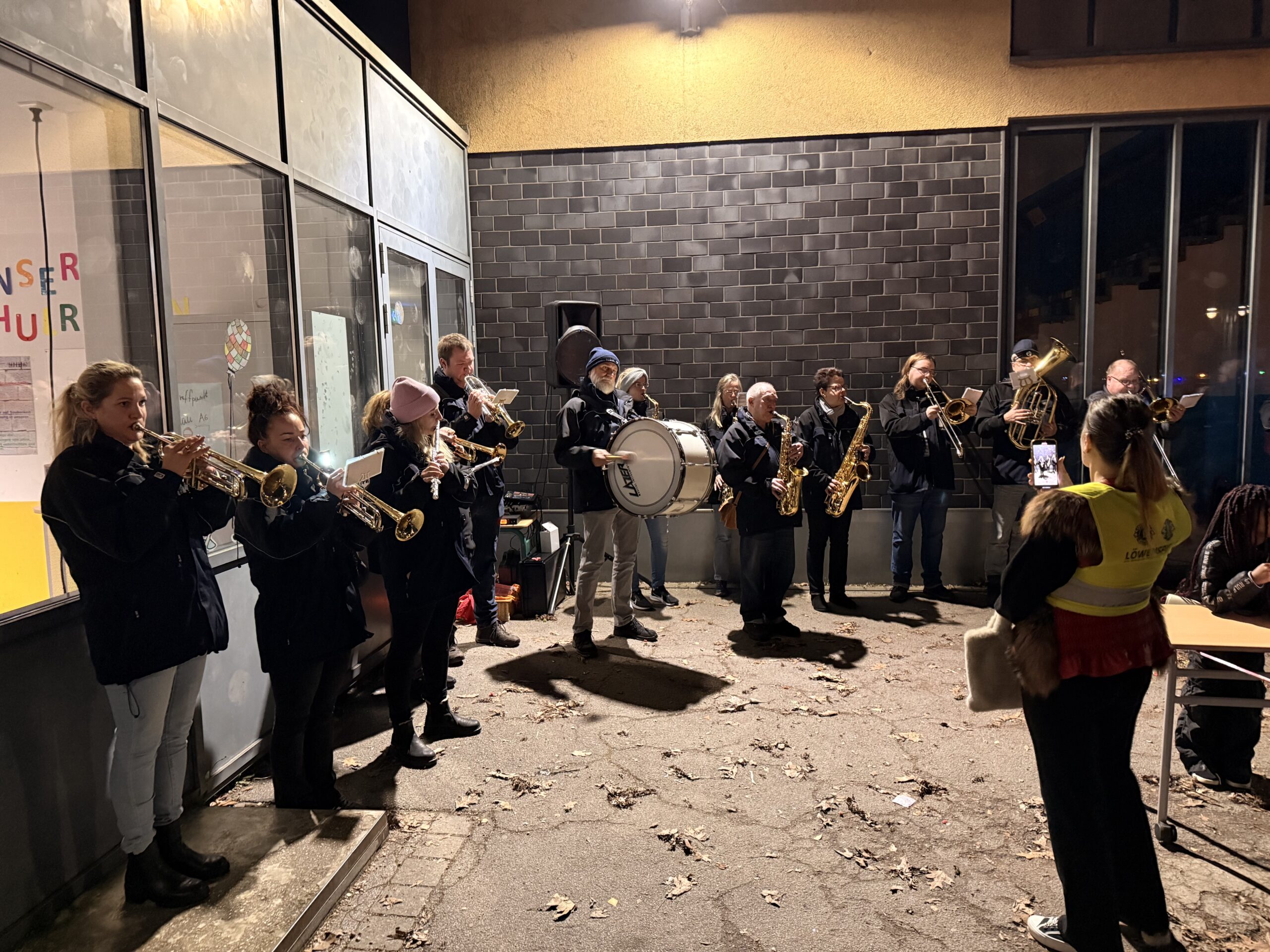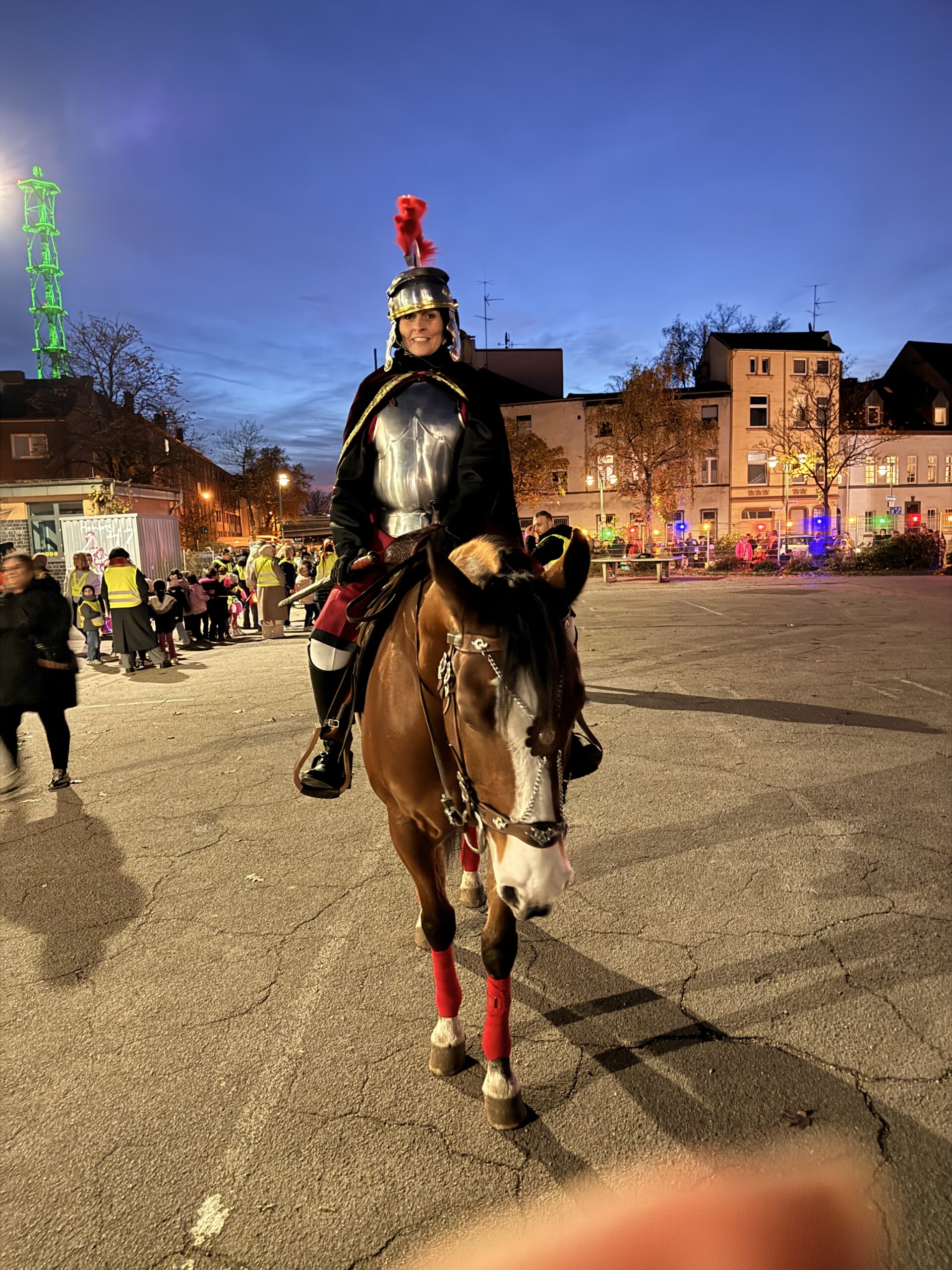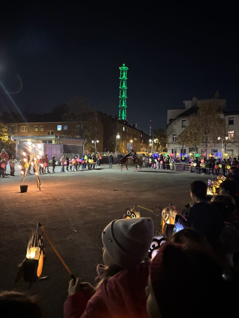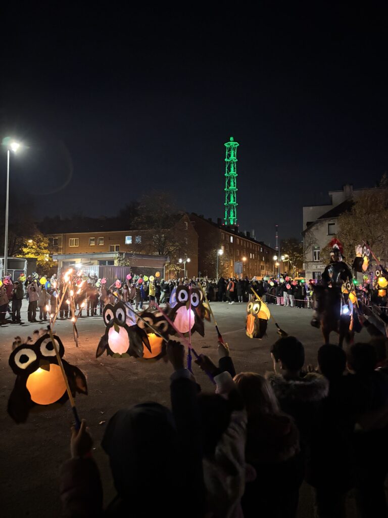 Gegen 18 Uhr begann der große Laternenumzug. Vom Schulhof aus zogen die Kinder, Eltern und Lehrkräfte mit ihren bunten Laternen durch die Duisburger Innenstadt. Eine Kapelle begleitete den Zug mit stimmungsvoller Musik, und vorneweg ritt St. Martin auf seinem Pferd. Überall leuchteten die schönsten Laternen – Delfine, Eulen, Igel und sogar lustige Monster waren zu sehen und sorgten für viele staunende Blicke am Straßenrand.